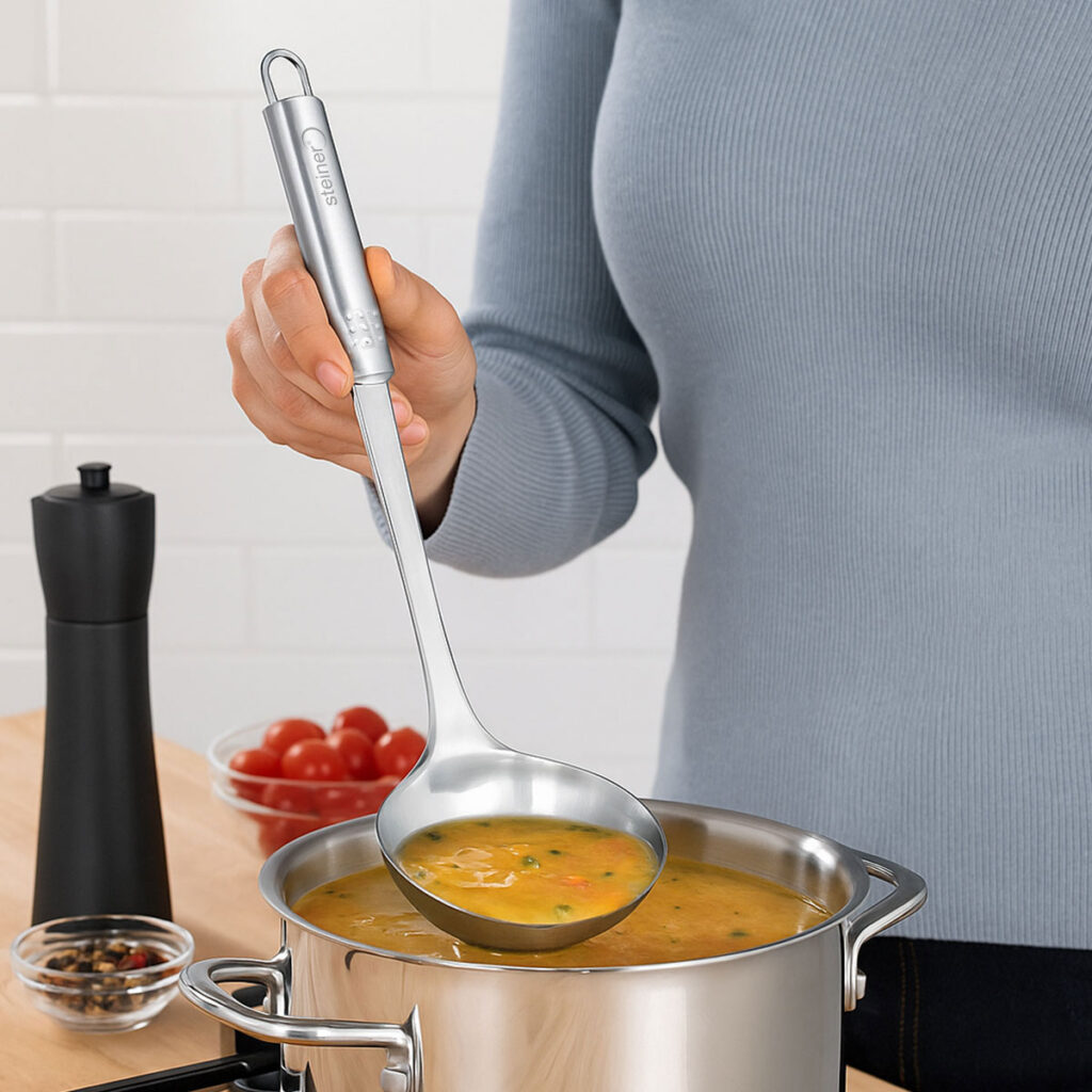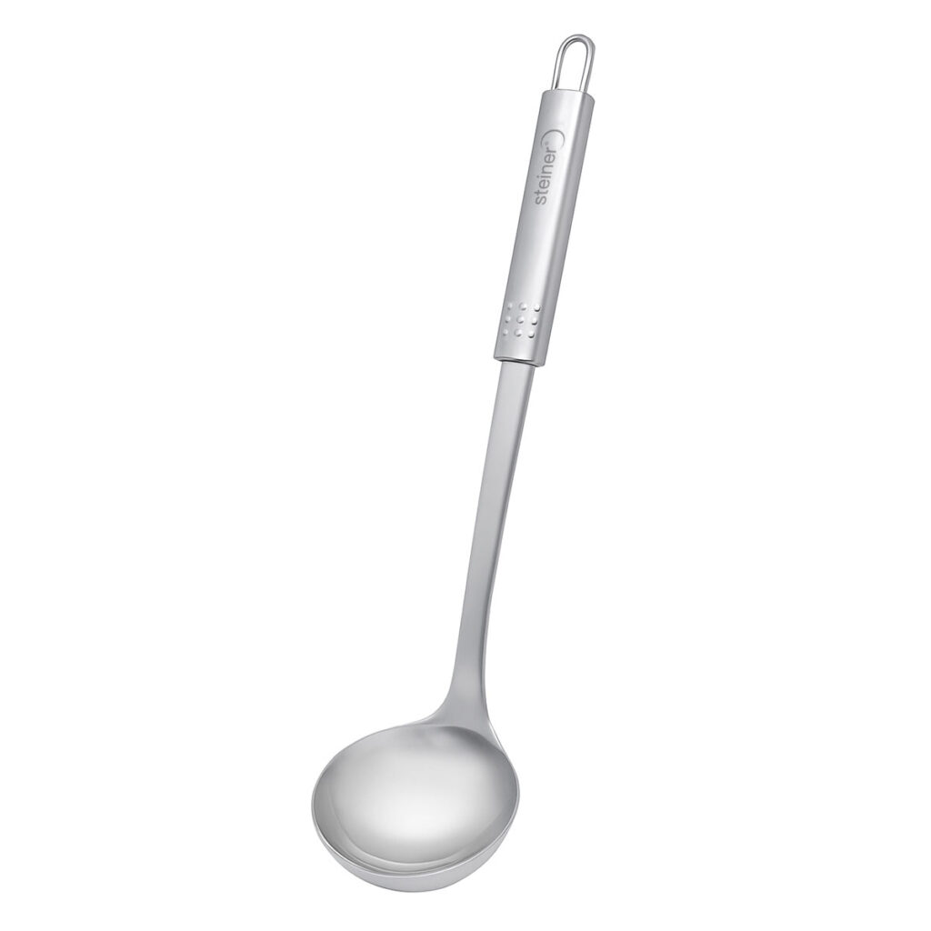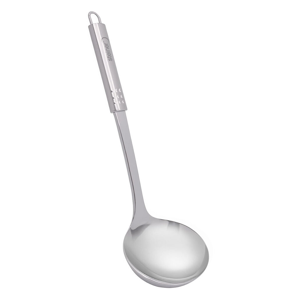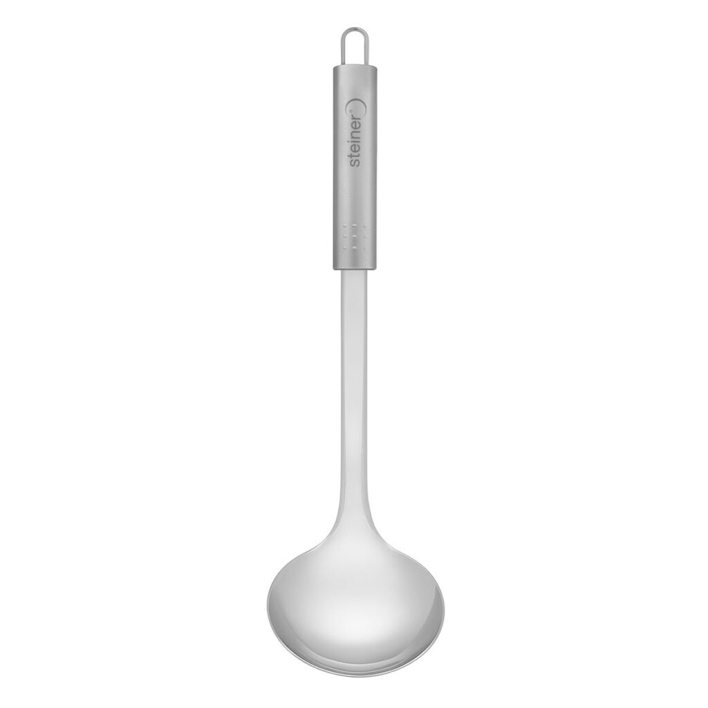 Eleva tu experiencia en la cocina con este cucharón de acero inoxidable de Steiner ST2021, diseñado para ofrecer funcionalidad, resistencia y estilo en cada uso. Su cuerpo robusto y acabado pulido lo hacen ideal para servir sopas, caldos y guisos con total precisión, mientras que su mango ergonómico proporciona un agarre cómodo y seguro.