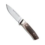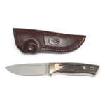 Cuchillo enterizo de caza modelo KODIAK referencia KODIAK-10A, fabricado con acero X50CrMoV15, cachas de asta de ciervo y alpaca. Incluye funda de cuero marrón. El peso del cuchillo es de 200 gr y la longitud de su hoja es de 10 cm.