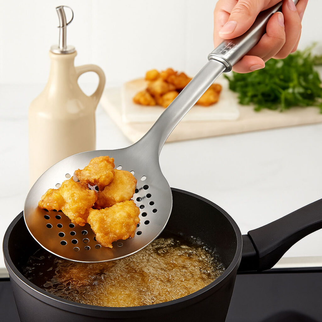 Fabricada en acero inoxidable de alta calidad, ofrece gran resistencia, durabilidad y un acabado elegante que se adapta a cualquier cocina. Su diseño con perforaciones permite escurrir fácilmente líquidos, ideal para servir verduras, pastas, frituras o alimentos cocidos.