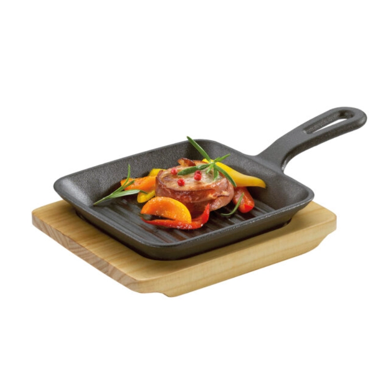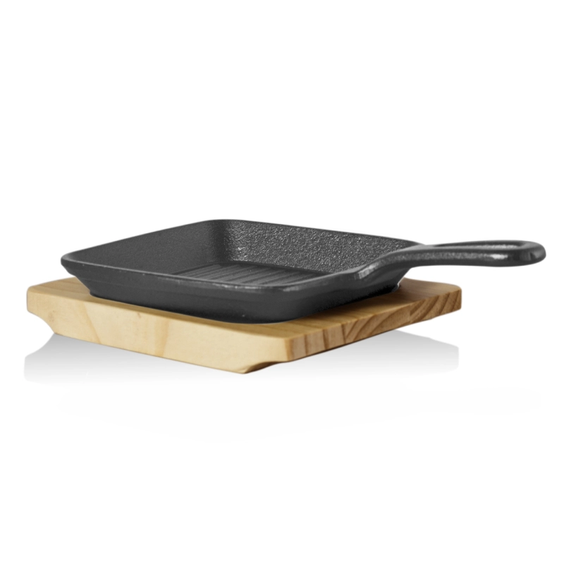 Sartén grill mini, sartén y base de madera