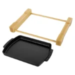 Este plato rectangular con una base de madera de la serie Accesorios Staub puede utilizarse para servir comida caliente en el comedor sin dañar la superficie de la mesa. Sus medidas son 33 x 23 cm y 4 cm de alto. Este plato de color negro es de hierro colado. Con este plato rectangular con base de madera sus invitados disfrutarán de una forma distinta de cocinar, especialmente carne.
