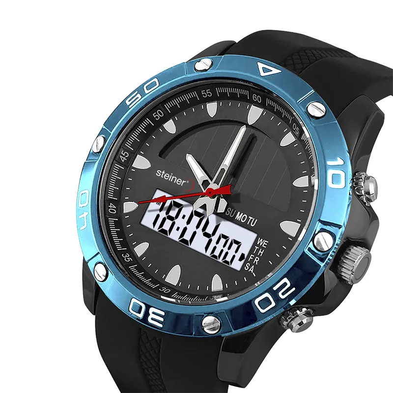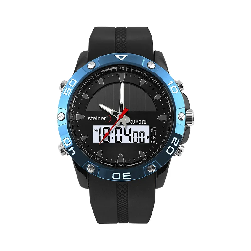 Diseño moderno y funcionalidad inteligente: el reloj de pulso Steiner combina lo mejor del mundo análogo y digital en un solo accesorio resistente y versátil. Su carátula incorpora un panel solar integrado, diseñado para extender significativamente la vida útil de la pila en el modo análogo, ideal para quienes buscan practicidad sin comprometer el estilo. Una vez reemplazada la pila, el reloj activa ambos modos simultáneamente (análogo y digital), ofreciendo todas las funciones que necesitas en tu día a día: hora dual, cronómetro, alarma y luz. Perfecto para uso diario, actividades al aire libre o como complemento deportivo, este reloj es una gran opción para quienes valoran durabilidad, eficiencia energética y diseño contemporáneo.
