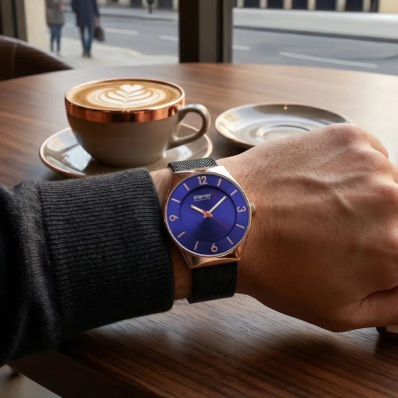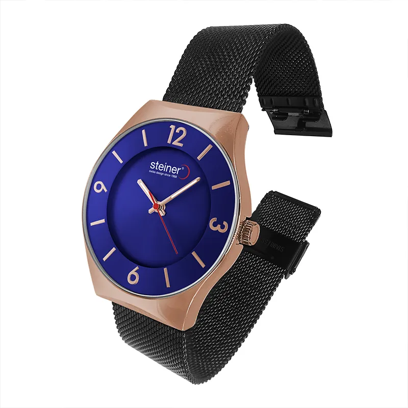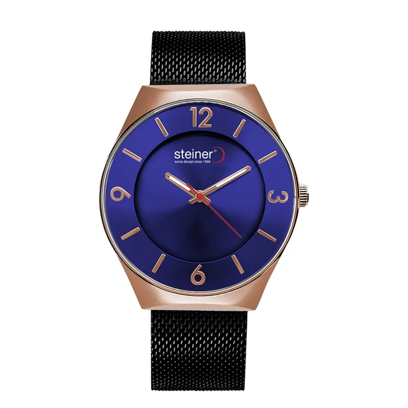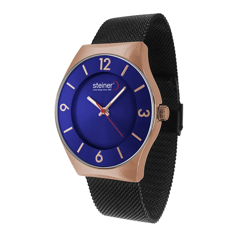 Este reloj para caballero de Steiner redefine la elegancia contemporánea con un diseño minimalista y sofisticado. Su carátula en tono Azul con acabado tipo sunray crea un sutil juego de luces, resaltando los indicadores y numerales en color oro rosado que aportan un contraste distinguido y de gran estilo.