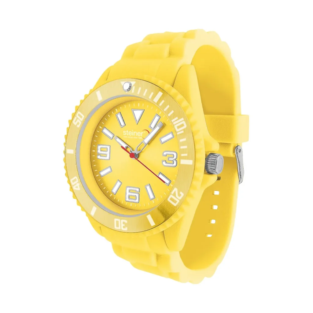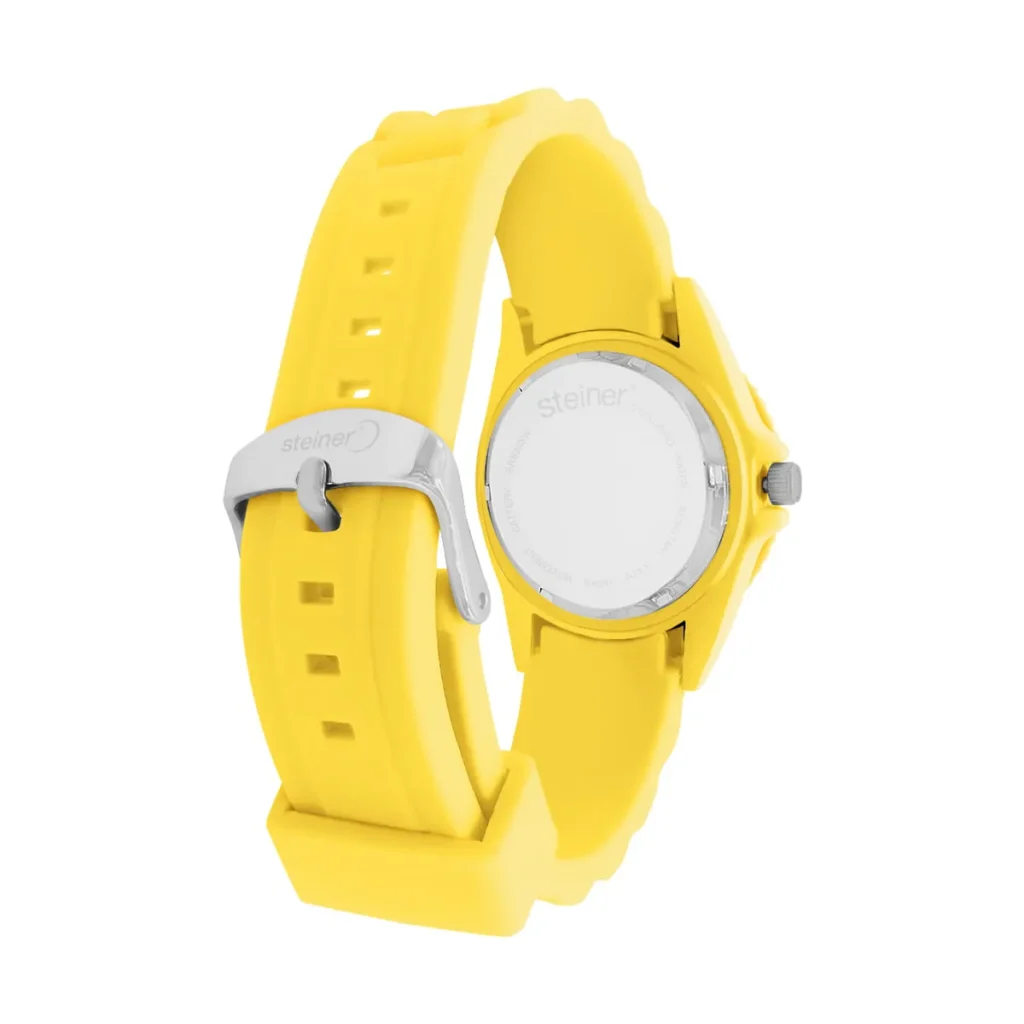 La correa de silicón en color amarillo brinda comodidad, ligereza y un ajuste seguro, ideal para el uso diario. Sus marcadores luminiscentes permiten una lectura clara incluso en condiciones de poca luz, y la corona protegida añade un extra de durabilidad y resistencia para un estilo de vida activo.
