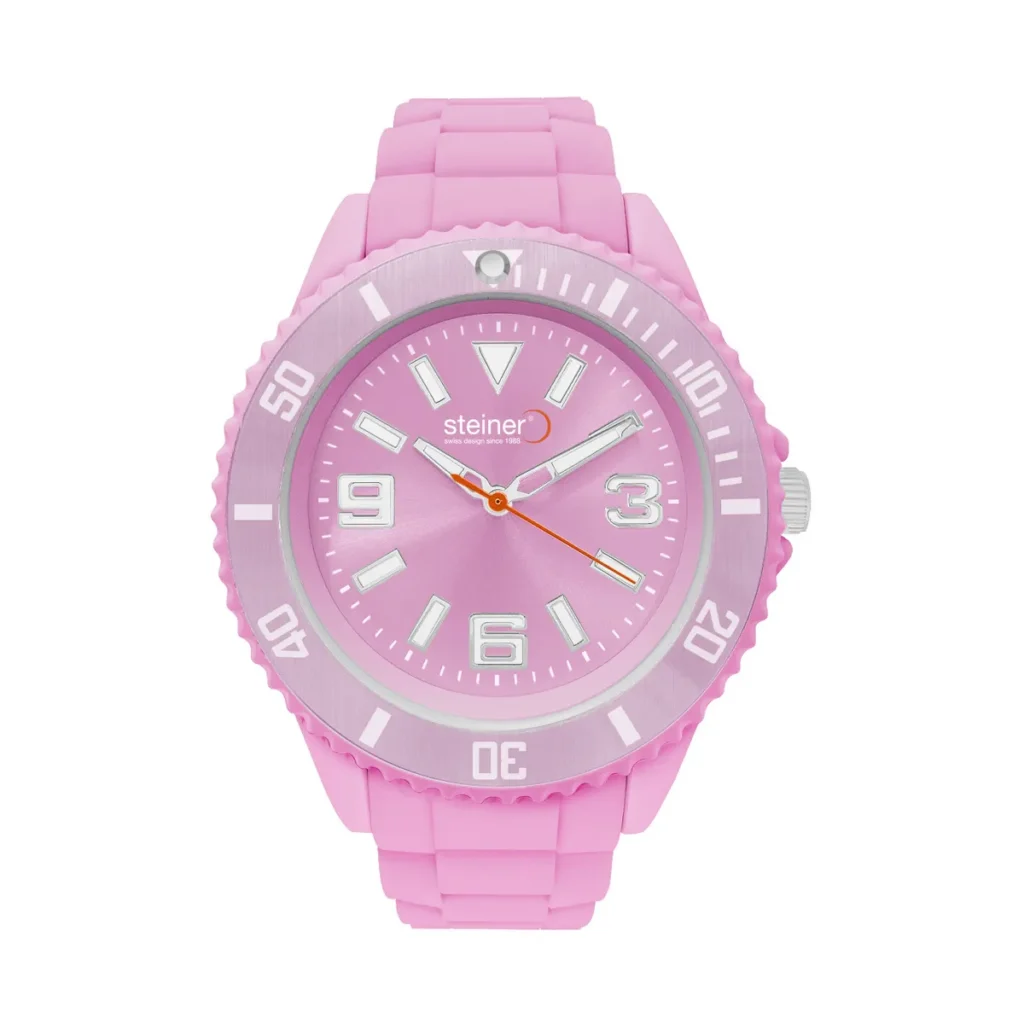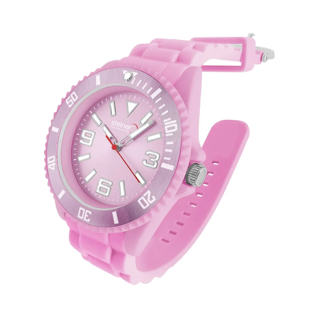 La correa de silicón en color morado brinda comodidad, ligereza y un ajuste seguro, ideal para el uso diario. Sus marcadores luminiscentes permiten una lectura clara incluso en condiciones de poca luz, y la corona protegida añade un extra de durabilidad y resistencia para un estilo de vida activo.