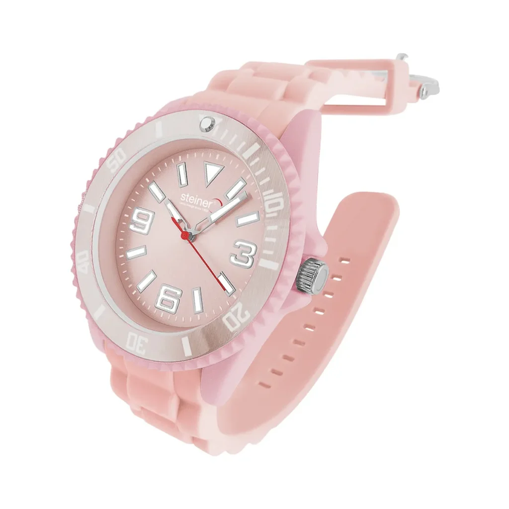 La correa de silicón en color rosa brinda comodidad, ligereza y un ajuste seguro, ideal para el uso diario. Sus marcadores luminiscentes permiten una lectura clara incluso en condiciones de poca luz, y la corona protegida añade un extra de durabilidad y resistencia para un estilo de vida activo.