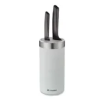 ¡La eficiencia se une al diseño!El bloque de cuchillos “Style” de ZASSENHAUS convence por su aspecto elegante combinado con ventajas prácticas.En las ranuras se pueden guardar de forma segura y ahorrando espacio hasta 10 cuchillos y siempre están a mano.El hermoso anillo de acero inoxidable completa el diseño práctico del bloque de cuchillos.